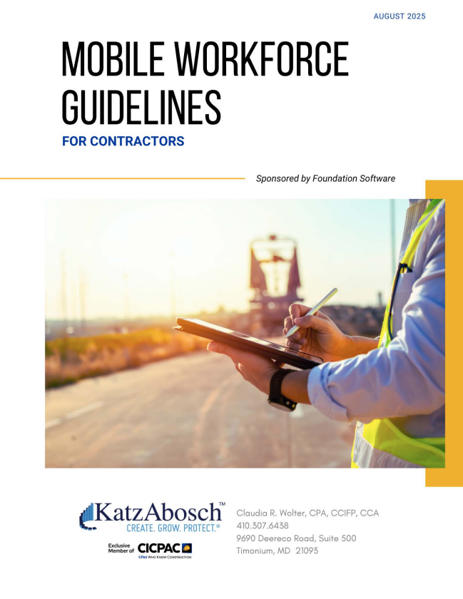 September 25, 2025 By: Claudia R. Wolter The Mobile Workforce 2025 white paper is your essential guide to navigating the complex landscape of travel, reimbursement, and tax compliance for contractors with mobile teams. Whether you’re managing crews across multiple job sites or refining your internal policies, this comprehensive resource helps you stay compliant, reduce costs, and support your workforce more effectively. Inside, you’ll discover: Updated IRS regulations impacting mileage rates, meals, and depreciation. Clear distinctions between accountable and non-accountable plans—and why it matters. Smart strategies for reimbursing travel expenses based on work assignment types. Best practices for per diems, company vehicles, and lodging. Ready-to-use templates for travel policies, expense forms, and vehicle use documentation. Download now to future-proof your mobile workforce strategy and stay ahead of 2025’s regulatory changes. Download the white paper Author: Claudia R. Wolter, CPA, CCIFP, CCA, CSSGB Claudia Wolter, a Shareholder and the Quality Control Director with KatzAbosch, joined the firm in 1988. She has played a major role in leading the firm into cutting-edge initiatives. She serves as a leader within the firm’s Accounting and Auditing Services Group and is a member of the Construction and Real Estate Services Group. A dedicated professional, Claudia holds the prestigious distinction of Certified Construction Industry Financial Professional (CCIFP), the designation of Certified Construction Auditor (CCA) from the National Association of Construction Auditors (NACA), and a Lean Six Sigma CPA Green Belt certification from Ohio State University ATI and Boomer Consulting, Inc. In addition, Claudia is an Executive Committee member of Construction Industry CPAs and Consultants (CICPAC) and serves on the Business and Industry Committee of the Maryland Association of Certified Public Accountants (MACPA). Get in Touch: Δ CompanyThis field is for validation purposes and should be left unchanged. First Email What Can I Help You With? Related KatzAbosch Articles Mobile Workforce: Guidelines for Contractors Construction Conversations with a Twist 2022 Tax Planning Opportunities for the Construction Industry